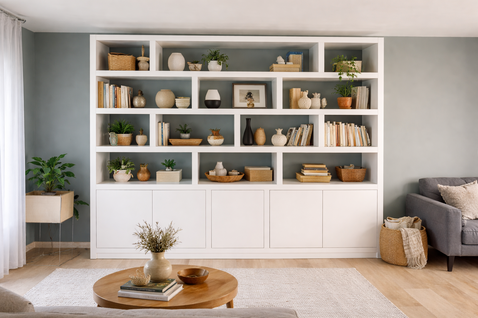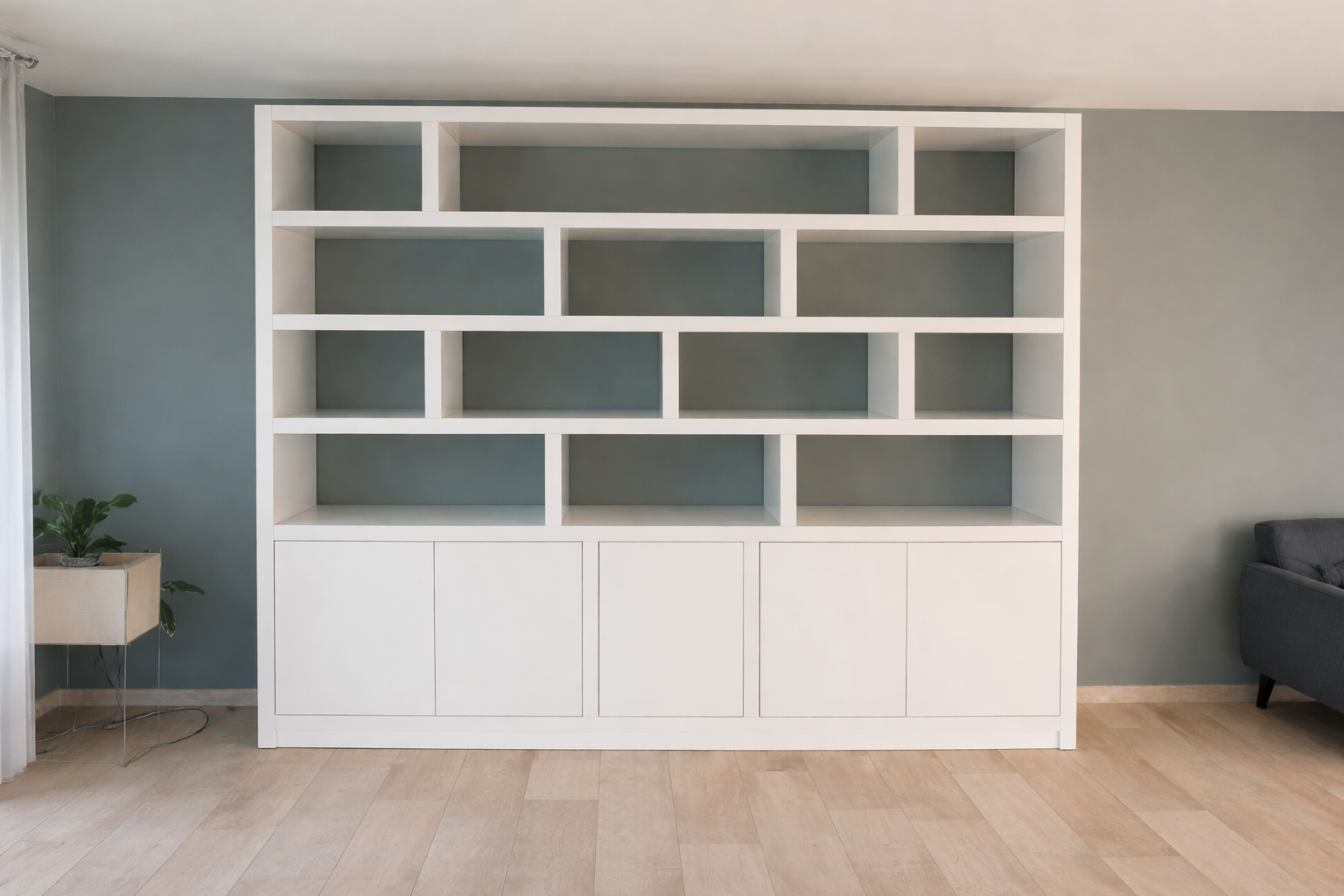 • Grote wandkast met open vakken en gesloten bergruimte