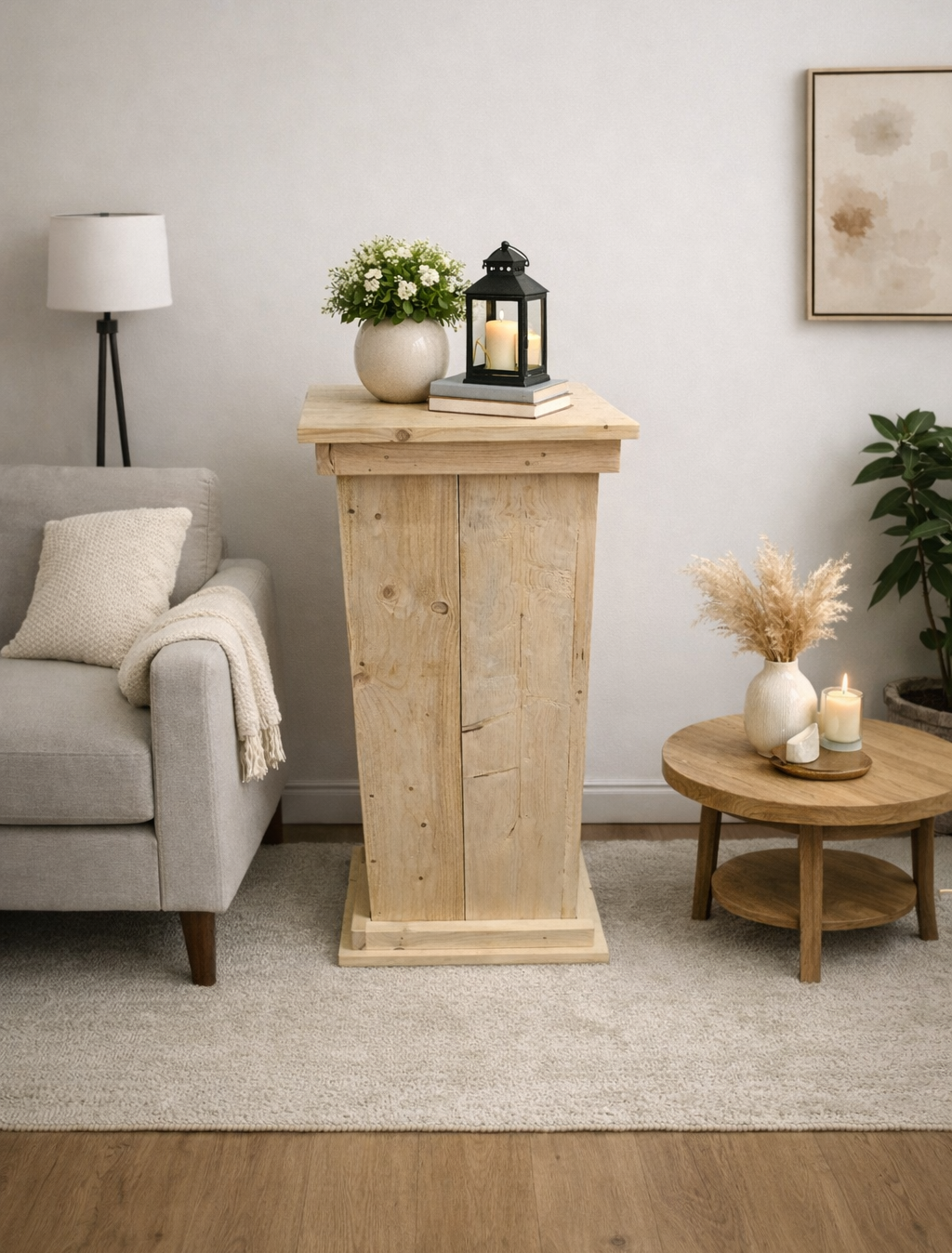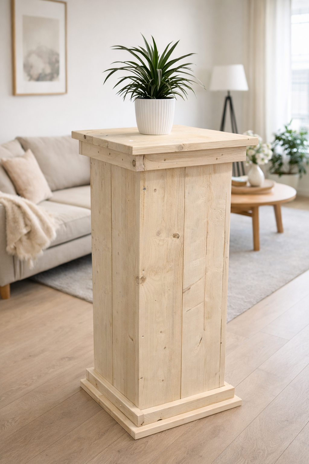 De steigerhouten zuil Wim is een robuuste en sfeervolle presentatiezuil die perfect past in zowel moderne als landelijke interieurs. Deze zuil is ideaal als sokkel, pilaar of presentatiezuil voor kunstobjecten, planten, beelden of decoratieve accessoires.